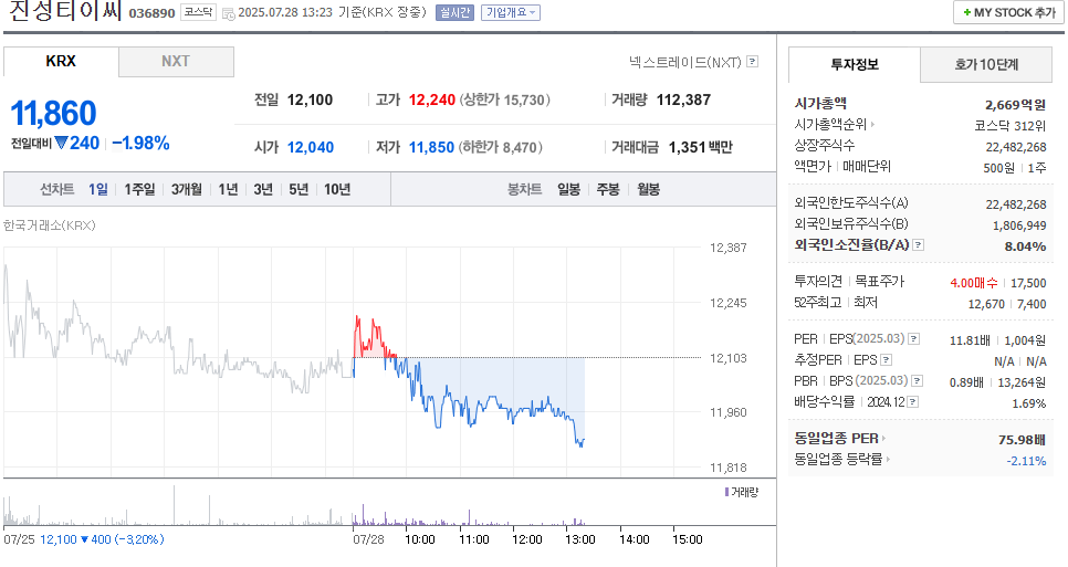 최근 유안타증권, 유진투자증권 등에서 발표된 보고서에 따르면 진성티이씨의 목표가는 ₩17,000~₩18,000 구간으로 제시되고 있습니다. 이는 현재 주가 대비 약 40~50% 이상의 상승 여력을 반영한 수치입니다.