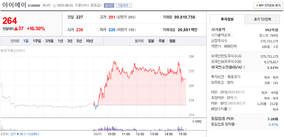 아이에이의 주가는 2025년 8월 초 기준 ₩264로 마감되었으며, 최근 하루에만 +16% 이상 급등했습니다. 이는 단기 수급이나 테마성 투자 흐름에 의한 결과로 보이며, 다음과 같은 시나리오로 주가 예측이 가능합니다. - 📈 단기 (1~3개월): 기술적 반등에 따른 ₩300 근접 가능 - 📉 중기 (3~6개월): 실적 개선 없을 시 ₩200대 재진입 가능성 - 🚀 장기 (1년+): 클라우드·전장 모듈 본격 실적화 시 ₩400 이상도 가능 중소형주의 경우 투자 심리, 수급, 정책 수혜에 따라 주가 등락이 크기 때문에 신중한 접근이 요구됩니다.